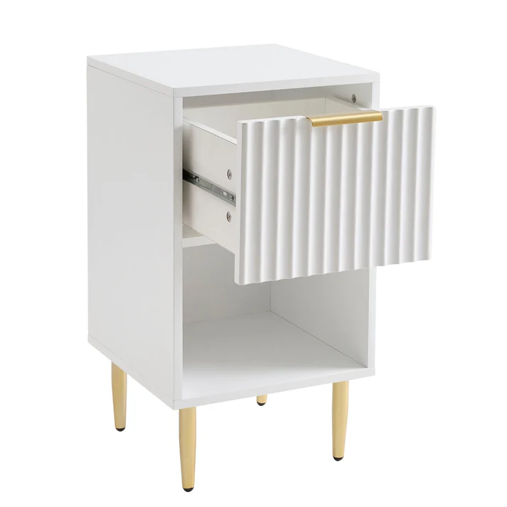 Featuring a spacious drawer for tucking away essentials and an open shelf for books or decorative accents, this nightstand combines smart storage with a modern, sophisticated look. The gold-toned handle and legs add just the right amount of luxury to make it a standout furniture addition.