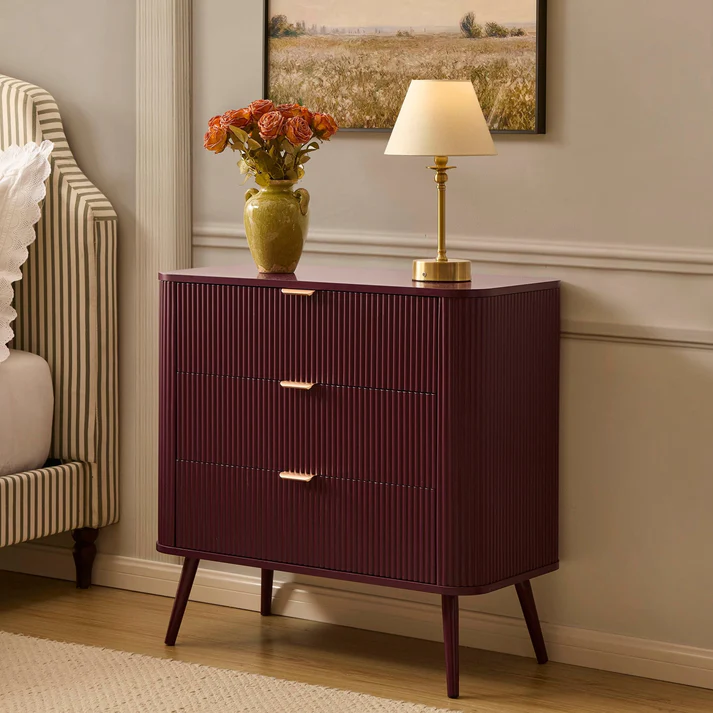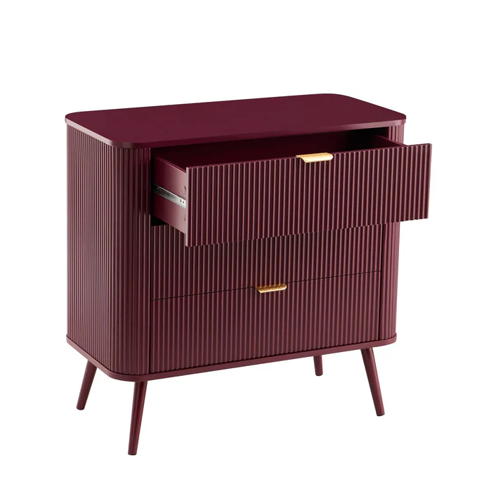 This burgundy chest of drawers is proof that smaller pieces can still make a bold statement. With its rich wine-red tone, fluted front and sleek gold handles, it brings just the right amount of drama to bedrooms, hallways, or even home offices. The compact size makes it ideal for tighter spaces, without sacrificing storage or style.