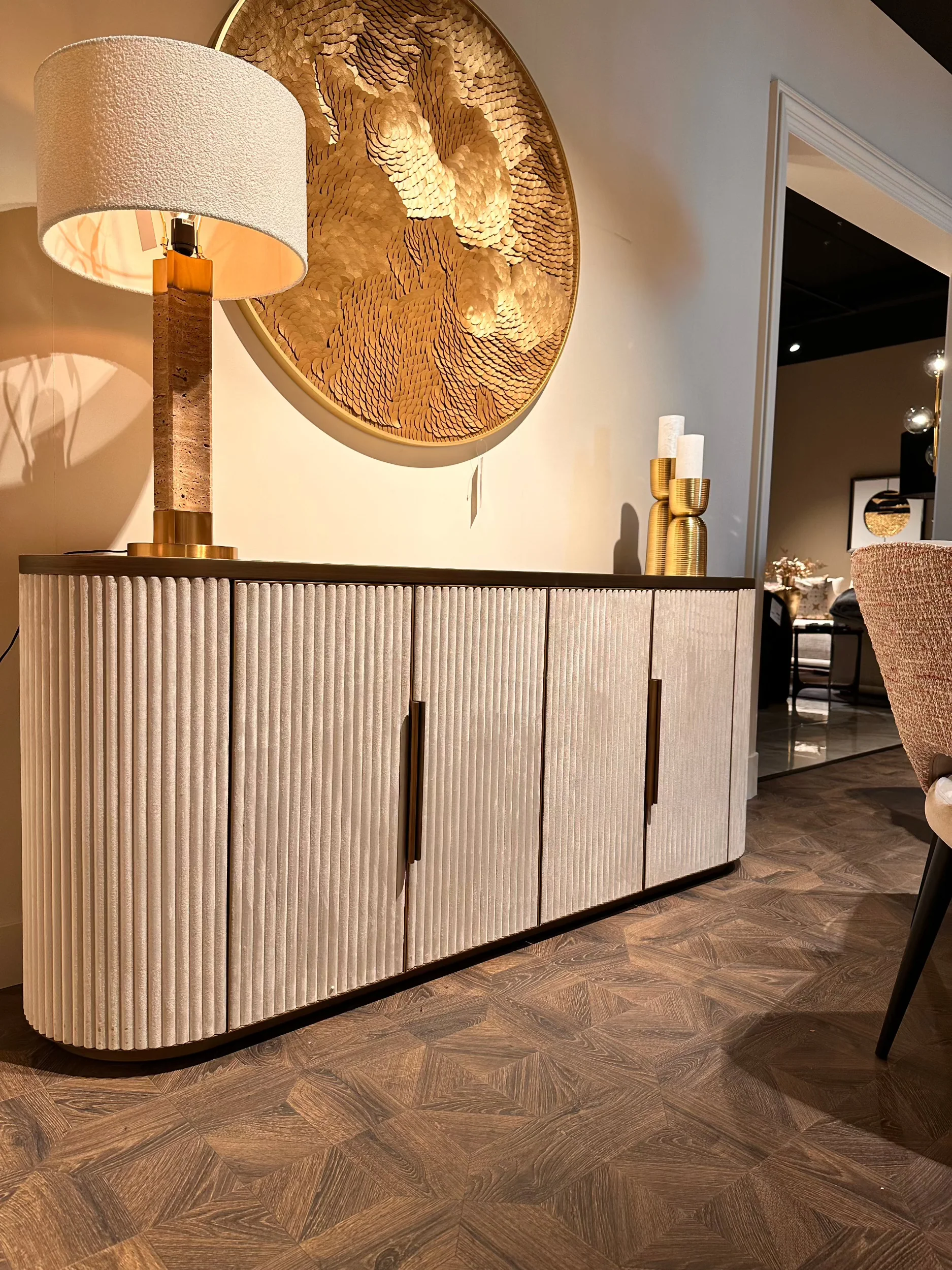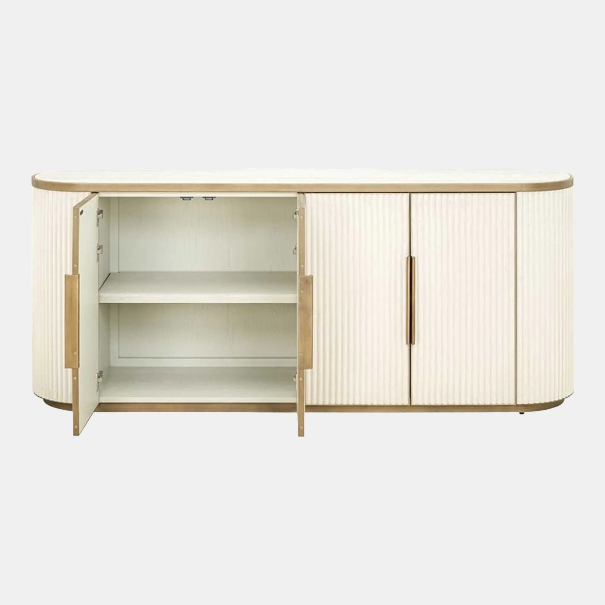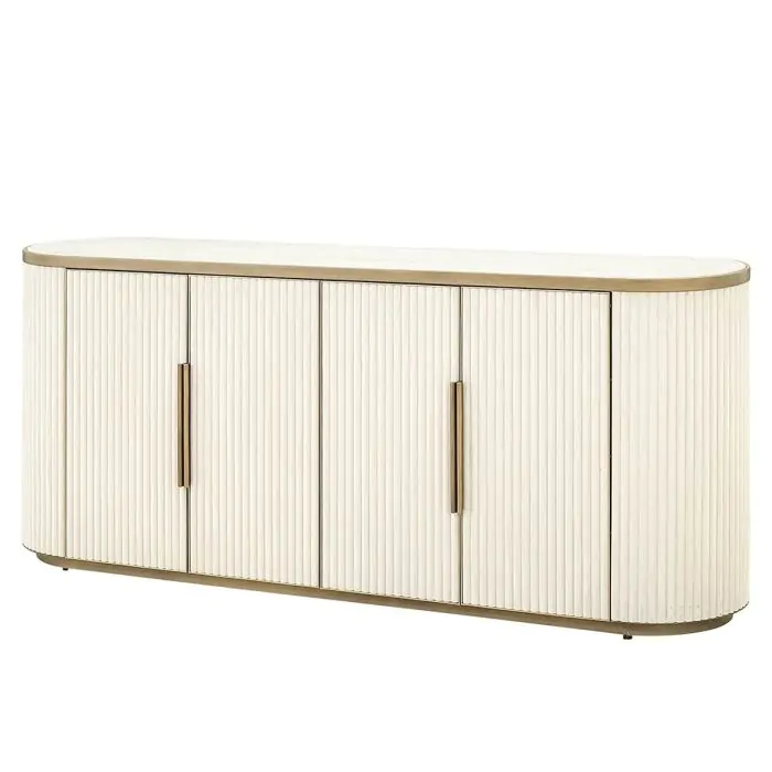 Luxury sideboard with fluted doors and stone top.